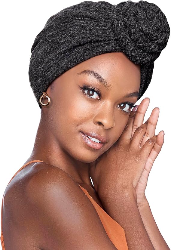 A black sweater knit turban from RED BY KISS (HQ411) designed for stylish hair protection and warmth. Soft, comfortable fabric helps maintain hairstyles while adding a fashionable touch.